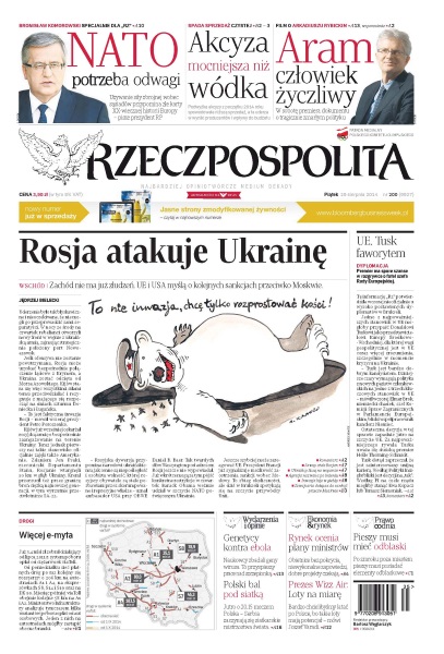 Rosja atakuje Ukrainę – Zachód nie ma już złudzeń, UE i USA myślą o kolejnych sankcjach przeciwko Moskwie; akcyza mocniejsza niż wódka – podwyżka akcyzy z początku 2014 roku spowodowała niższą sprzedaż, a ta uderza w wyniki producentów i wpływy do budżetu; Aram, człowiek życzliwy – w sobotę premiera dokumentu o tragicznie zmarłym polityku; genetycy kontra ebola – naukowcy zbadali geny wirusa, to przyspieszy prace nad szczepionką; polski bal pod siatką – jutro o 20.15 meczem Polska – Serbia zaczynają się siatkarskie mistrzostwa świata; pieszy musi mieć odblaski – po zmroku poza miastem pieszy musi posiadać elementy odblaskowe.