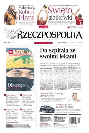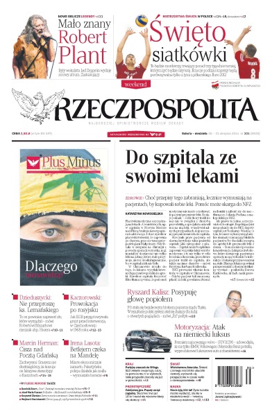 Do szpitala ze swoimi lekami – choć przepisy tego zabraniają, lecznice wymuszają na pacjentach, by kupowali sobie leki – pomóc może skarga do NFZ; mało znany Robert Plant – były wokalista Led Zeppelin wydaje solowy album, zaskakujący; święto siatkówki – to będzie morderczy, trwający ponad trzy tygodnie turniej, którym żyć będzie cały kraj – emocje podczas imprezy będą porównywalne tylko z tymi z piłkarskiego Euro 2012; partyjny znaczek do liftingu – SLD zmienia swoje logo, liczy, że pomoże mu to w wyborach, takie przypadki zdarzały się już w przeszłości; wielobarwna Ameryka – śmierć czarnego nastolatka obudziła demony, wydawało się przepędzone w czasie walki o równouprawnienie.