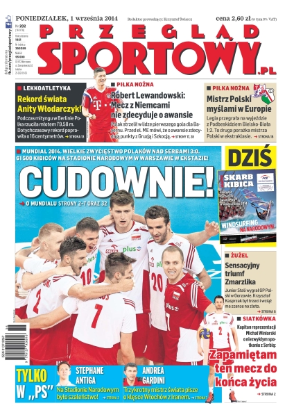 Polacy pokazali całemu światu, jak zrobić wielkie show; mecz, który przeszedł do historii – polska - Serbia 3:0; w Polsce zaczynają się drugie – obok siatkówki – mistrzostwa świata, a w nich także będziemy walczyć o podium; dwie nasze osady na podium MŚ w Holandii; nasze załogi zdominowały Baja Poland – to był wspaniały występ kierowców Lotto Team; Kolumbijczyk Anacona wygrał etap, jego rodak Quintana został liderem Vuelta a Espana; Anita Włodarczyk pobiła rekord świata Betty Heidler; w US Open los Agnieszki Radwańskiej podzieliło wiele gwiazd; Nico Rosberg posypał głowę popiołem i wziął odpowiedzialność za kolizję z Lewisem Hamiltonem podczas Grand Prix Belgii.