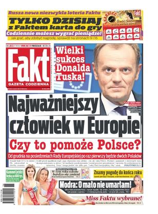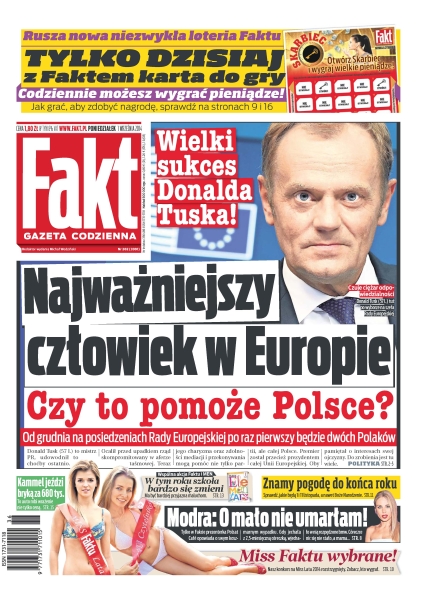 Donald Tusk nowym prezydentem Europy – jeszcze nigdy nasz rodak nie zajmował w Brukseli tak wysokiego stanowiska – mamy dowód, że się tam z nami liczą i nas słuchają; dzięki stanowisku w Radzie Europejskiej Donald Tusk ustawi się na całe życie – oby nie zapomniał o Polakach; Wałęsa w windzie z dziewczyną Pawlaka; Magda Modra była o krok od tragedii; Miss faktu 2014; jak przekonać dziecko do szkoły; ważne zmiany w szkołach; Wesołowski chce mieć dziecko, a żona się wykręca; Kammel wozi się autem za 680 000; nasza reprezentacja w meczu otwarcia mistrzostw świata rozbiła Serbów 3:0; snajper Bayernu chce pokazać klasę w drużynie narodowej i awansować na Euro 2016; wielki sukces – w Rajdzie Baja Poland całe podium zajęli Polacy.