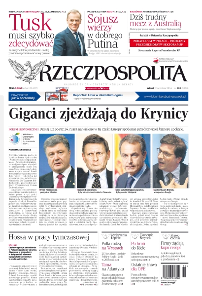 Dzisiaj już po raz 24. rusza największe w tej części Europy spotkanie przedstawicieli biznesu i polityki; Na szczycie UE w październiku Polskę powinien reprezentować już nowy premier – Donald Tusk musi to rozważyć; Marszałek Sejmu może zostać nie tylko premierem, ale i szefową PO; Czwarty rok z rzędu Polki w Wielkiej Brytanii są liderkami w liczbie rodzonych dzieci; W czwartek sojusz ogłosi, że umowa z Rosją z 1997 roku wciąż obowiązuje – Polsce nie udało się odwołać zapisów ograniczających nasze prawa w pakcie; pierwsza wielka i przegrana bitwa na wschodzie kraju może mieć wpływ na wewnętrzną politykę Kijowa; gigantyczna zapora może oddzielić Ocean Atlantycki od Morza Śródziemnego i połączyć dwa kontynenty – Europę i Afrykę; Karolina Woźniacka po świetnej grze pokonała Marię Szarapową 6:4, 2:6, 6:2.