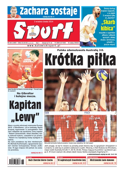 Po wygranych z Serbią i Australią po 3:0 biało-czerwoni już sobie zapewnili awans do drugiej fazy; po zwycięstwie nad Włochami wczoraj Irańczycy pokonali kolejnego wielkiego faworyta – Stany Zjednoczone; selekcjoner Polski Adam Nawałka uważa, że Gibraltar prezentuje poziom zbliżony do reprezentacji Litwy; lista 10 najdroższych transferów lata w Europie zdominowana jest przez zawodników z Ameryki Południowej; Grigorij Łaguta wraca na częstochowski tor – „Lwy” z Rosjaninem w składzie walczyć będą o uniknięcie barażu; po raz pierwszy w historii US Open do ćwierćfinału dotarły tylko dwie z dziesięciu najwyżej rozstawionych zawodniczek; nowym liderem Wyścigu Dookoła Hiszpanii został czwarty na etapie Hiszpan Alberto Contador; w Memoriale Borisa Hanżekovicia polska zawodniczka na dystanie 1500 m zajęła drugie miejsce.
