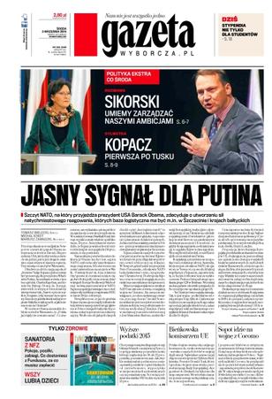Szczyt NATO, na który przyjeżdża prezydent USA Barack Obama, zdecyduje o utworzeniu sił natychmiastowego reagowania, których baza logistyczna ma być m.in. w Szczecinie i krajach bałtyckich; z Donaldem Tuskiem do Brukseli pojedzie Elżbieta Bieńkowska – to ona obejmie ważną tekę komisarza ds. rynku wewnętrznego, którą mamy dostać; dlaczego skorumpowany celnik pracuje w biurze PiS; ostatni odcinek cyklu reporterskiego o inspiratorach wojny na wschodzie Ukrainy; ukraińskie oddziały nadal się wycofują – Kijów twierdzi, że to tylko przegrupowanie sił; w ciągu ledwie pięciu lat odpływ lodu z Grenlandii i Antarktydy przyspieszył aż dwukrotnie; studenci mogą się ubiegać o stypendia od fundacji, stowarzyszeń, firm i samorządów; na targach w Kielcach działalność zainaugurowała Polska Grupa Zbrojeniowa; Rosja może sprzedać Chinom udziały w jednym z największych złóż ropy naftowej na Syberii, a Gazprom po rozpoczęciu budowy pierwszego gazociągu do Chin kusi Pekin kolejną rurą.