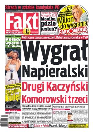Napieralski wygrywa debatę, Kaczyński drugi, a Komorowski trzeci; Julia Kamińska wygrywa „Taniec z Gwiazdami”; w Szczecinie awaria prądu uwięziła rodziny z dziećmi na kole diabelskiego młyna; reporterzy Faktu na tropie jednej z największych kryminalnych zagadek ostatniej dekady.
