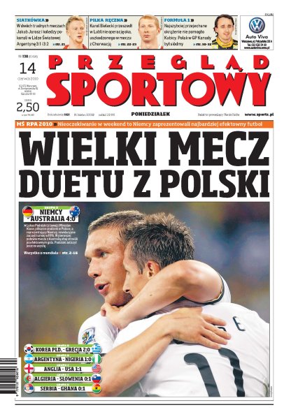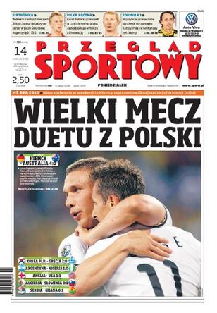 Nieoczekiwanie w weekend to Niemcy zaprezentowali najbardziej efektowny futbol; w dwóch trudnych meczach Jakub Jarosz i jego koledzy pokonali w Lidze Światowej Argentynę 3:1 i 3:2; Karol Bielecki przeszedł w Lublinie operację oka uszkodzonego w meczu z Chorwacją; najszybciej przejechane okrążenie nie pomogło Kubicy – Polak w GP Kanady był siódmy; nie takiej inauguracji mundialu oczekiwali kibice z Wysp – dzięki kardynalnemu błędowi Roberta Greena Amerykanie wywalczyli punkt; dziś do boju rusza kolejny wielki faworyt – holenderską siłę będą chcieli powstrzymać Duńczycy, którzy słyną z żelaznej obrony.