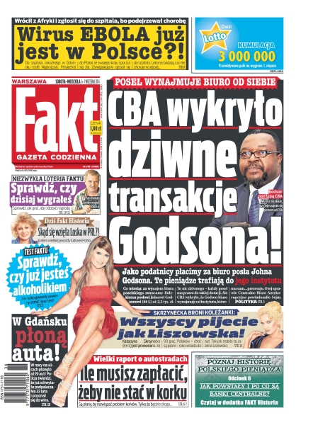 CBA wykryło dziwne transakcje Godsona; do objęcia stanowiska marszałka ustawiła się już kolejka kandydatów; czyżby rodzina Tusków miała się rozjechać po świecie; zapłacimy po 135 zł, żeby nie było korków; kto pokocha Strasburgera; Skrzynecka broni koleżanki – aktorka sugeruje, że większość ludzi prowadzi po pijaku; ile trzeba zarabiać, by w przyszłości dostać równowartość średniej emerytury, czyli 1500 zł; czy rząd premiera Donalda Tuska nienawidzi spółdzielczości; nasi najlepsi siatkarze mogą odpoczywać, bo ich zmiennicy spisują się świetnie; atakujący reprezentacji Polski twierdzi, że Albicelestes to jeden z trudniejszych rywali w naszej grupie; w weekend niezwykłe wydarzenie na największym polskim stadionie.
