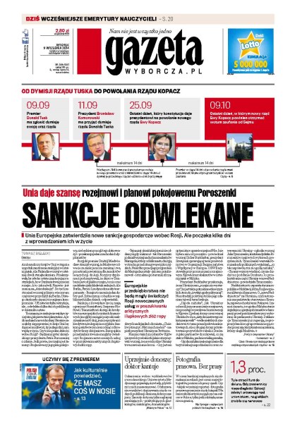 Unia Europejska zatwierdziła nowe sankcje gospodarcze wobec Rosji, ale poczeka kilka dni z wprowadzeniem ich w życie; oskarżenia wobec wykładowców z wrocławskiego Uniwersytetu Medycznego pojawiają się wtedy, gdy któryś z nich ma awansować; w coraz bardziej rządzących się obrazkami mediach jest coraz mniej fotografów a poziom ich pracy spadł; 1,3 proc. – tyle stracił funt do dolara, gdy zwolennicy niepodległości Szkocji zdobyli przewagę nad unionistami, na giełdach zrobiło się nerwowo.