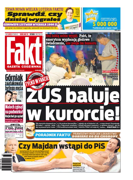 ZUS baluje w kurorcie; Górniak zaatakowała byłego męża; maluch zginął na podwórku rozjechany przez sąsiada; uwaga rodzice: idole waszych dzieci piją, palą, uprawiają seks; czy Radek Majdan wstąpi do PiS; ksiądz namawiał do brania łapówki; niemiecka mina zabiła nurka; grzybiarz cztery dni błądził po lesie.