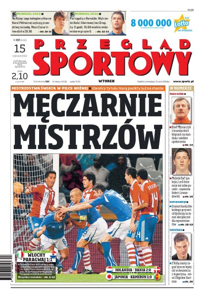 Obrońcy tytułu Mistrza Świata tracą już na starcie przez remis z Paragwajem; Józef Młynarczyk opowiada o bramkarskich klopsach na mundialu i wielkim upokorzeniu; Robert Lewandowski zapewnia: Lech sobie beze mnie poradzi; wznowiono dyskusję o ubezpieczeniach dla reprezentantów po dramacie Karola Bieleckiego.
