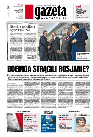 Donald Tusk podał wczoraj rząd do dymisji, i choć prezydent nie desygnował jeszcze Ewy Kopacz na premiera, to trwają już kadrowe przymiarki; system przeciwlotniczy Buk, z którego zapewne zestrzelono maszynę Malaysia Airlines, obsługiwali Rosjanie w mundurach bez dystynkcji – opowiadają dziennikarzowi programu BBC „Panorama” mieszkańcy Donbasu; Kopacz uległa PiS w sprawie przemocy; jak policja znalazła i zgubiła prof. Domańskiego; Irena Kwiatkowska zwróciła się do PZU o odszkodowanie za śmierć syna, zamiast pieniędzy dostała listę pytań.