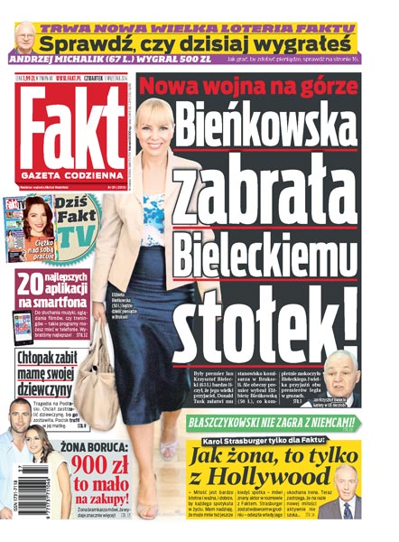 Nowa wojna na górze: Bieńkowska zabrała Bieleckiemu stołek; żona Boruca: 900 zł to mało na zakupy; Karol Strasburger: jak żona, to tylko z Hollywood; 20 najlepszych aplikacji na smartfona; Błaszczykowski nie zagra z Niemcami z powodu kontuzji; bezczelność seksposła Szeligi; nieznana historia Leszka Balcerowicza.