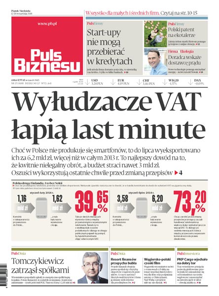 Oszuści wykorzystują ostatnie chwile przed zmianą przepisów: choć w Polsce nie produkuje się smartfonów, to do lipca wyeksportowano ich za 6,2 mld zł, więcej niż w całym 2013 r. – to najlepszy dowód na to, że kwitnie nielegalny obrót, a budżet straci nawet 3 mld zł; wiceminister gospodarki ogłosił, że energetyczne spółki kupią kopalnie, potem tłumaczył, że został źle zrozumiany, ale było to kosztowne zamieszanie — rynek przecenił PGE, Tauron i Eneę o 2,65 mld zł; resort finansów przepycha bubla: projekt klauzuli obejścia prawa spotkał się z krytyką ekspertów i rządowych prawników, autorzy natomiast skrytykowali krytyków i forsują zmiany niekorzystne dla przedsiębiorców; węgierski wiceminister mówi o rozmowach z Polską na temat wspólnej linii kredytowej dla firm oraz podpisania umowy z Chińczykami – nad Wisłą o projekcie nikt nic nie słyszał; PKP Cargo wjechało na dobry tor: trzy wrześniowe przejęcia pozwolą giełdowemu przewoźnikowi uniezależnić się od koniunktury na rynku węglowym i zaoszczędzić na inwestycjach w tabor; jeśli młoda firma dostanie pożyczkę, to niewielką i na krótko i tylko w kilku bankach; polski patent na ekotalerze: założycielom marki Biotrem pomagają krajowe i unijne dotacje; doradca wskaże dostawcę prądu: nowe technologie pomogą oszczędzać energię.
