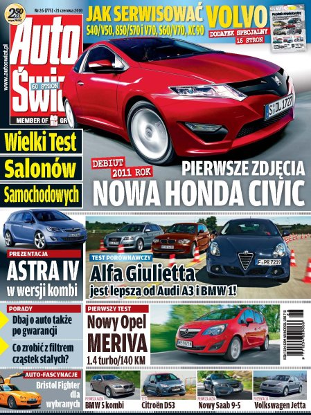 Za dwa lata na rynku ma pojawić się nowa generacja Civica – jeszcze bardziej agresywna, dynamiczna i oczywiście hybrydowa; można już składać zamówienia na nowe kombi BMW serii 5 – auto stworzone, by cieszyć użytkowników; na salonie paryskim w październiku oficjalnie zadebiutuje wersja kombi czwartej generacji Opla Astry; na początku lipca w salonach Abartha pojawią się nowe Punto Evo i 500 cabrio; test Citroena DS3 1.6 THP Sport CHIC; porównanie Alfy Romeo Giulietta 1.4 TB, Audi A3 Sportback 1.4 TFSI, BMW 116i; jak przygotować się do wyjazdu, żeby urlop nie zaczął się od problemów; dziesięć pytań dotyczących przeglądów technicznych; co zrobić, żeby długa wakacyjna podróż nie była stresująca dla dziecka; o czym należy pamiętać przed wypożyczeniem przyczepy.
