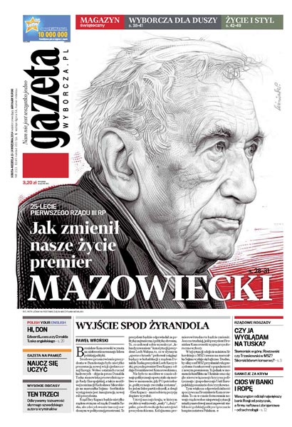 25-lecie pierwszego rządu III RP: jak zmienił nasze życie premier Mazowiecki; rządowe roszady: Siemoniak w górę, Rostowski czy Trzaskowski w MSZ; Waszyngton odciął największy bank Rosji od pożyczek, a firmy naftowe i zbrojeniowe – od technologii; Edward Lucas uczy Donalda Tuska angielskiego; trudna wojna z kalifatem; poczucie frustracji i niezadowolenia z polskiego kapitalizmu to efekt braku wyobraźni, bo to ona dyktuje ludziom zmysł współpracy – na normalność poczekamy jeszcze 20 lat – mówi Stefan Bratkowski; przez dwa lata wynajęliśmy pokój 50 cudzoziemcom, doczekaliśmy się w sieci 39 recenzji i pięciu gwiazdek – oto pamiętnik warszawskiej „gospodyni” z serwisu Airbnb.