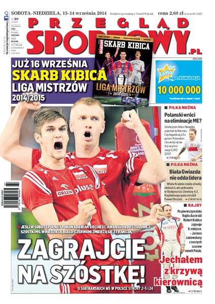 Jeśli w sobotę Polacy pokonają Iran 3:0 lub 3:1, awansują do czołowej szóstki MŚ, w niedzielę biało-czerwoni zmierzą się z Francją; selekcjoner Adam Nawałka pojechał do Niemiec, czy dogada się z Eugenem Polanskim i ten wróci do kadry na eliminacje EURO 2016; Biała Gwiazda nie odda lidera: Wisła Kraków miała chwilę słabości, ale pokonała w Bydgoszczy Zawiszę 4:2; oo pierwszym dniu Rajdu Australii Robert Kubica zajmuje 8. miejsce i twierdzi, że jest zadowolony z osiąganych czasów; Afryka, Ameryki, Azja/Pacyfik i Europa walczą w Marakeszu, gdzie Anita Włodarczyk może ustanowić kolejny rekord świata; Vuelta a Espana: Contador, Valverde czy Froome – kto będzie najlepszy; w 2. kolejce PGNiG Superligi mężczyzn najciekawiej zapowiadają się starcia Śląska Wrocław z Wisłą Płock i MMTS Kwidzyn ze Stalą Mielec.
