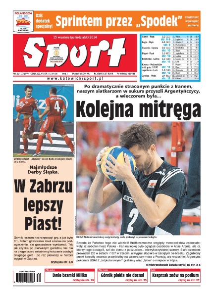 Kolejna mitręga – po dramatycznie straconym punkcie z Iranem, naszym siatkarzom przyszli Argentyńczycy; w Zabrzu lepszy Piast – najmłodsze Derby Śląska; wielki spektakl w stolicy – siedem bramek, sporo emocji i widowiskowa gra obu drużyn, to nie było jedno z najlepszych spotkań rundy jesiennej – Legia Warszawa pokonała Śląsk Wrocław 4-3; Anita bogatsza – na niemal pustym stadionie w Marrakeszu zespół Europy, na czele z Anitą Włodarczyk, wygrał kończące sezon zawody o Puchar Interkontynentalny.