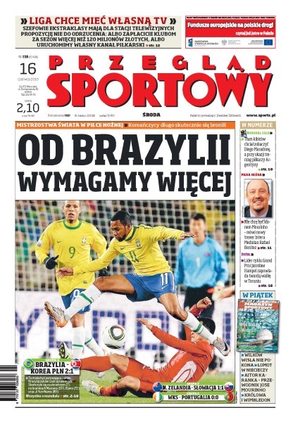 Koreańczycy długo skutecznie bronili swojej bramki, a Brazylijczycy nie zachwycili; szefowie Ekstraklasy ostrzegają: większe kwoty dla klubów, albo własny kanał piłkarski; nowy trener Interu Mediolan o swojej pracy; tłumy kibiców chciały zobaczyć Diego Maradonę oraz trening jego podopiecznych.