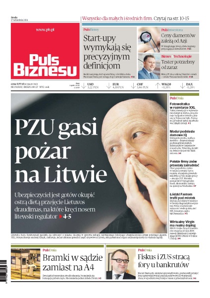 PZU gasi pożar na Litwie – ubezpieczyciel jest gotów okupić ostrą dietą przejęcie Lietuvos draudimas, na które kręci nosem litewski regulator; bramki w sądzie zamiast na A4 – zwycięskie konsorcjum straciło zlecenie, bo zmieniła się koncepcja poboru myta, nie zamierza jednak składać broni; fiskus i ZUS stracą fory u bankrutów – Marek Biernacki, minister sprawiedliwości, postanowił położyć kres uprzywilejowanej pozycji państwowych wierzycieli, staną w upadłościowej kolejce razem z przedsiębiorcami; moduł podniesie domowe IQ – inteligenta pralka, myśląca żarówka — internet rzeczy pochłonął krakowskich informatyków i inżynierów z Seed Labs – twierdzą, że nikt na świecie nie jest tak bliski sukcesu; wirtualny Virgin ma realny doping – EBOR i trójka innych inwestorów wesprze 40 mln EUR rozwój działalności największego MVNO świata w Polsce i Turcji.
