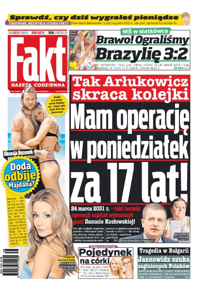 Mam operację w poniedziałek za 17 lat – tak Arłukowicz skraca kolejki – 24 marca 2013 roku, taki termin operacji szpital wyznaczył pani Danucie Kozłowskiej; czy Doda odbije Majdana – Radosław Majdan wiernie trwa przy Małgorzacie Rozenek, ale perfekcyjna pani domu jest bardzo zazdrosna o przystojnego bramkarza; jasnowidz szuka zaginionych Polaków – słynny polski jasnowidz Krzysztof Jackowski pomaga w poszukiwaniu Joanny i Maksymiliana – nie ma jednak dobrych przeczuć; ograliśmy Brazylię 3:2 – po dramatycznym meczu, przegrywając w setach 1:2, nasi chłopcy podnieśli się i pokonali mistrzów świata, w czwartek gramy z Rosją.