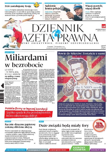 Miliardami w bezrobocie – 5,6 mld zł – to kwota, jaką w 2015 roku wydamy na walkę o nowe miejsca pracy; polskie firmy w lepszej kondycji – szybko spada liczba przedsiębiorstw, które odnotowują deficyt; ręcznie skręcane papierosy zostaną obłożone akcyzą – wyroby z automatów do własnoręcznego wytwarzania papierosów będą obłożone akcyzą – wynika z projektu ustawy okołobudżetowej; duże związki będą miały fory – rząd planuje zwiększenie uprawnień dużych związków zawodowych, chce to osiągnąć przez podniesienie progów reprezentatywności, czyli odsetka załogi należącego do danej organizacji pracowniczej; dziś zaatakujemy Rosję – to będzie najbardziej emocjonujący mecz tych mistrzostw i to nie tylko ze sportowego punktu widzenia; sędziowie kontra policja – drogówka walczy z piratami, zabierając im prawa jazdy, ale sędziowie każą je oddawać.