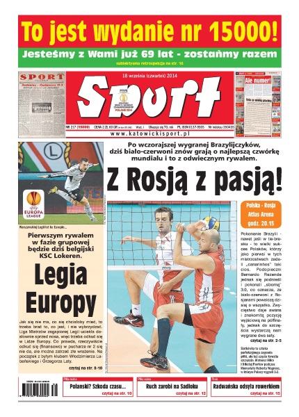 Z Rosją z pasją – po wczorajszej wygranej Brazylijczyków, dziś biało-czerwoni znów grają o najlepszą czwórkę mundialu i to z odwiecznym rywalem; Legia Europy – pierwszym rywalem w fazie grupowej będzie dziś belgijski KSC Lokeren; Boateng wyręczył „Lewego” – Bayern rzutem na taśmę pokonał Manchester City, na pierwsze trafienie na Allianz Arenie musi jeszcze poczekać Robert Lewandowski; „Krycha” w obronie trofeum – dziewięciu biało-czerwonych znajduje się w kadrach uczestników Ligi Europy, kilka z tych zespołów na pewno mierzy wysoko - nawet w ostateczny triumf; Radwańska w ćwierćfinale – nasza „jedynka” zagra z Amerykanką, Varvarą Lepchenko.