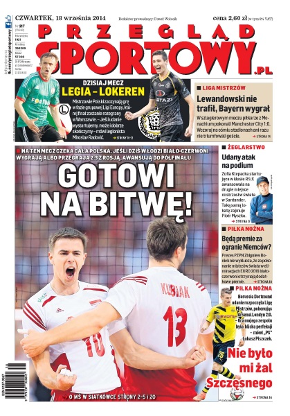 Gotowi na bitwę – na ten mecz czeka cała Polska, jeśli dziś w Łodzi biało-czerwoni wygrają albo przegrają 2-3 z Rosją, awansują do półfinału; dzisiaj mecz Legia vs Lokeren – Mistrzowie Polski zaczynają grę w fazie grupowej Ligi Europy, której finał zostanie rozegrany w Warszawie; Lewandowski nie trafił, Bayern wygrał – w szlagierowym meczu piłkarze z Monachium pokonali Manchester City 1:0 – wczoraj na ośmiu stadionach ani razu nie triumfowali goście; nie było mi żal Szczęsnego – Borussia Dortmund udanie rozpoczęła Ligę Mistrzów, pokonując Arsenal Londyn 2:0 – „Gra mojego zespołu była bliska perfekcji” - Łukasz Piszczek.
