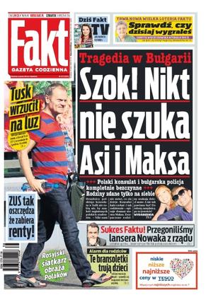 Szok, nikt nie szuka Asi i Maksa – polski konsulat i bułgarska policja kompletnie bezczynne, rodziny zdane tylko na siebie; alarm dla rodziców, te bransoletki trują dzieci – jeśli już musisz je kupić sprawdź, czy mają atest Unii Europejskiej; przegoniliśmy lansera Nowaka z rządu – już był w ogródku..., dzięki nam pan Tik-Tak jednak poza żłobem; ZUS tak oszczędza, że zabiera renty; rosyjski siatkarz obraża Polaków; Tusk wrzucił na luz – w kraju same problemy, a Donald Tusk ma wakacje do 1 grudnia, i to widać; Doda i Rozenek wypiękniały dla Majdana – co on ma w sobie takiego, że kobiety postanawiają zmieniać się dla niego z szarych myszek w seksbomby; dostaną premię, jak wygrają z Niemcami – Zbigniew Boniek sugeruje, że taki sukces wart byłby specjalnej nagrody dla zawodników.
