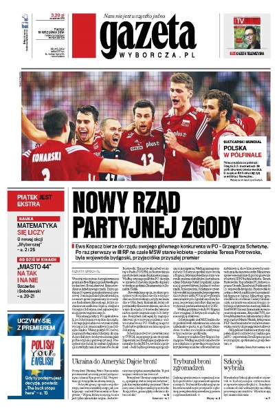 Nowy rząd partyjnej zgody – Ewa Kopacz bierze do rządu swojego głównego konkurenta w PO – Grzegorza Schetynę – po raz pierwszy w III RP na czele MSW stanie kobieta – posłanka Teresa Piotrowska, była wojewoda bydgoski, przyjaciółka przyszłej premier; Ukraina chce broni od Ameryki – prezydent Ukrainy Petro Poroszenko przemawiał wczoraj przed połączonymi izbami Kongresu USA, przywitano go trzyipółminutową owacją; Trybunał broni zgromadzeń – znikną ograniczenia w organizacji małych protestów i zgromadzeń spontanicznych, Trybunał Konstytucyjny zakwestionował część przepisów z głośnej prezydenckiej nowelizacji prawa o zgromadzeniach; Szkocja wybrała – mieszkańcy Szkocji głosowali w czwartek w historycznym referendum w sprawie niepodległości.
