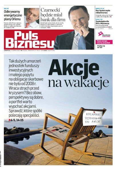 Tak dużych umorzeń jednostek funduszy inwestycyjnych i małego popytu na obligacje skarbowe nie było od 2008 r.; handel detaliczny od trzech miesięcy rośnie w tempie przekraczającym 20 proc. rocznie; giganci branży energetycznej, czeskie i arabskie fundusze czy Kulczyk Investments – to lista potencjalnych partnerów; drogowcy żądają 40 mln euro za fuszerki na A1; przybywa ofert pracy w branży transportowo-logistycznej; akcje na długi dystans, czyli Tauron kontra PGE; trudności z dostępem do finansowania sprawiły, że przedsiębiorcy chętniej sięgają po usługi firm faktoringowych; wbrew potocznym opiniom kryzys nie oznacza dla branży gwałtownego wzrostu obrotów.