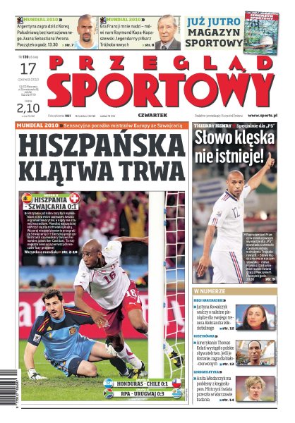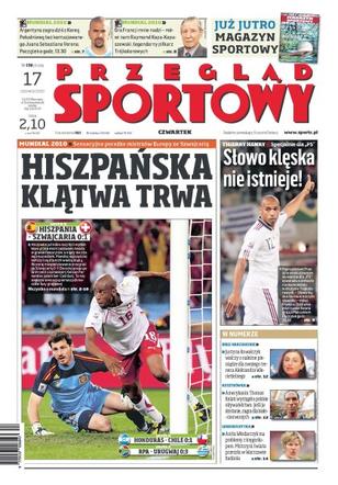 Pierwsza wielka sensacja mundialu, jeden z głównych faworytów turnieju kompletnie zawiódł; Chile doczekało się pierwszego mundialowego zwycięstwa po 48 latach; bez względu na wynik meczu z Koreą Południową Maradona będzie miał powody do satysfakcji; wywiad z Thierrym Henrym, piłkarzem reprezentacji Francji; Aleksander Wierietielny, trener Justyny Kowalczyk, ma teraz niższą pensję niż przed igrzyskami w Vancouver; walka pomiędzy Łomaczem i Żygadłą jest utrudniona, bo reszta drużyny dopiero się tworzy; młociarki Anity Włodarczyk zabraknie w drużynowych ME.