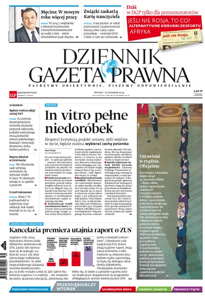 Eksperci krytykuja projekt ustawy o in vitro: jeśli wejdzie w życie, będzie można wybierać cechy potomka; będzie można odjąć mniej VAT: na nowym, dwustopniowym systemie ustalania proporcji odliczenia podatku naliczonego stracą jednostki sektora publicznego, fundacje i instytucje finansowe, a zyska budżet państwa; mętny alkohol w internecie: we Wrocławiu sądy uchylają zezwolenia na sprzedaż wódki w sieci, w Gliwicach uznają to za zgodne z prawem; uczeń luksusowy: klasy I–VI podstawówki to najdrozszy etap edukacji, rok nauki kosztuje tu 8,1 tys. zł rocznie; kancelaria premiera utajnia raport o ZUS dotyczący nieprawidłowego działania systemu informatycznego; Ewa Kopacz formalnie objęła urząd 14. premiera Polski; w 2015 r. wejdziemy z niższym bezrobociem i nowymi instrumentami do walki z nim – mówi wiceminister Jacek Męcina; nauczyciele ze szkół prywatnych i państwowych muszą mieć takie same przywileje – twierdzi ZNP i idzie z tym do trybunału.