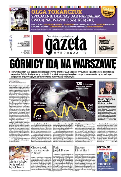 Górnicy idą na Warszawę: związkowcy ze śląskich spółek węglowych wykorzystują zmianę rządu, by wywalczyć połączenie przynoszących straty kopalń z dochodową energetyką; rozmowa z Leszkiem Balcerowiczem; Mariusz Wlazły: na igrzyskach w Rio będę kibicem; Chodorkowski rzuca wyzwanie Putinowi; ratować klimat Ziemi: tak wielkiej demonstracji jak w niedzielę na Manhattanie nie było w Ameryce od lat – przyszło 400 tys. ludzi i przed wtorkowym szczytem klimatycznym ONZ domagali się bardziej energicznej walki z globalnym ociepleniem; jak wykupić mieszkanie komunalne; komu należy się renta rodzinna, komu socjalna.