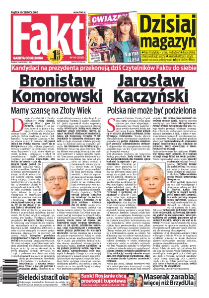 Kandydaci na prezydenta przekonują dziś czytelników Faktu do siebie; najlepszym lekarzom z Niemiec i z Polski nie udało się uratować oka Karola Bieleckiego; Rosjanie planują przetopić tupolewa; Rafał Maserak zarabia więcej niż Julia „Brzydula” Kamińska.