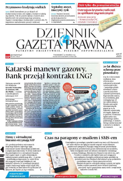 Qatargas sprzedał lub finalizuje sprzedaż kontraktu na dostawy LNG dla PGNiG – wynika z nieoficjalnych informacji DGP; pacjenci leczeni innowacyjnymi procedurami protestują przeciw zbędnemu przetrzymywaniu w szpitalach; przymusowo kredytują wielkich; 20 lat dłuższa ochrona praw piosenkarzy; czas na paragony e-mailem i SMS-em; firmy z wirtualnymi biurami otrzymają NIP.