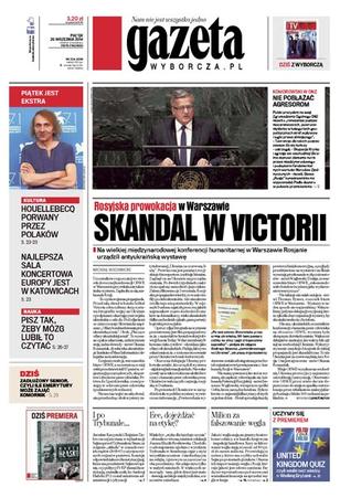 Skandal w Victorii: na wielkiej wielkiej międzynarodowej konferencji humanitarnej w Warszawie Rosjanie urządzili antyukraińską wystawę; polski prezydent na sesji Zgromadzenia Ogólnego ONZ mówił o „renesansie postaw mocarstwowych, powrocie myślenia w kategoriach geopolitycznych stref wpływów i logiki prawa silniejszego”; Jarosław Kaczyński i Zbigniew Ziobro raczej nie staną w tej kadencji Sejmu przed Trybunałem Stanu za ściganie „układu” w czasach swoich rządów (2005-07) zużyciem różnych organów państwa; miała być „etyka dla każdego ucznia” – obiecała to wiosną minister edukacji Joanna Kluzik-Rostkowska, ale udaje się to tylko w małych miastach; jakość węgla mają na granicy kontrolować celnicy, a w handlu krajowym– inspekcja handlowa, kary za fałszowanie węgla mają wynosić od 50 tys. zł do nawet miliona; Houellebecq porwany przez Polaków; najlepsza sala koncertowa Europy jest w Katowicach; pisz tak, żeby mózg lubił to czytać.