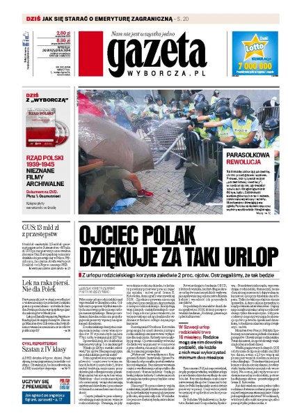 Z urlopu rodzicielskiego korzysta zaledwie 2 proc. ojców – ostrzegaliśmy, że tak będzie; GUS po raz pierwszy oszacował na zlecenie Unii Europejskiej rozmiary działalności przestępczej w Polsce; lek na raka piersi nie dla Polek; ADHD dotyka 4-8 proc. dzieci, stale słyszą, że są niegrzeczne, że zrobiły coś złego – chwalmy je, bo konsekwencją ADHD może być depresja; protest, który zyskał miano „parasolkowej rewolucji”, w niedzielną noc zgromadził na ulicach Hongkongu około 80 tys. ludzi.