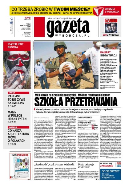 MEN stawia na szkolenia nauczycieli, MSW na montowanie kamer – niemal połowa uczniów podstawówek jest obrażana, co dziesiąty regularnie nękany; Rafał Trzaskowski ds. europejskich, Jacek Rostowski od gospodarki – to oni będą wśród najbliższych doradców Kopacz; Kalifat sięgnął do Turcji – trwa dramatyczna walka o miasto Kobane na turecko-syryjskim pograniczu; Bieńkowska przesłuchana – chyba zdała; kubański rynek nie lubi czarnych ani Mulatów.