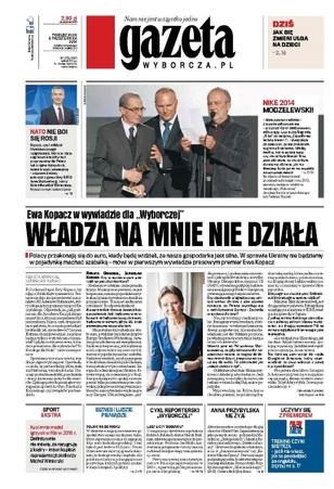 „Władza na mnie nie działa. Polacy przekonają się do euro, kiedy będą widzieli, że nasza gospodarka jest silna. W sprawie Ukrainy nie będziemy w pojedynkę machać szabelką” – Ewa Kopacz w wywiadzie dla „Wyborczej”; NATO nie boi się Rosji – szpica, czyli oddział błyskawicznego reagowania, który w razie zagrożenia miałby być przerzucony do Polski lub krajów bałtyckich, mimo krytyki powstanie – zapewnia nowy sekretarz generalny NATO Jens Stoltenberg, który dziś odwiedza Warszawę; Ania Przybylska nie żyje – aktorka zmarła w niedzielę po długiej chorobie, miała 35 lat; rolnik na dorobku – w statystyce unijnej za towarowe gospodarstwo uznaje się dopiero takie, które zapewnia rocznie co najmniej 4 tys. euro dochodu z produkcji.