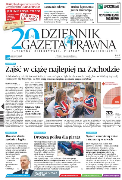 Dziennik Gazeta Prawna – codziennie obiektywne i rzetelne informacje z kraju i ze świata. Piszemy o tym, co dziś ważne i odpowiadamy na Wasze pytania – szczególnie te związane z obecnymi wyzwaniami tj. pandemia, praca zdalna. Na bieżąco wyjaśniamy zmieniające się przepisy. Wspieramy się wyjaśnieniami ministerstw i urzędów. Pomagamy unikać błędów i ostrzegamy, jakie są kary. Ponadto w każdy piątek specjalne magazynowe wydanie Dziennika Gazety Prawnej w całości z tekstami społeczno-ekonomicznymi.