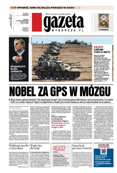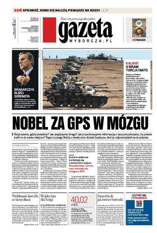 Noble za gps w mózgu – skąd wiemy, gdzie jesteśmy, jak znajdujemy drogę, jak przechowujemy informację o naszym położeniu, by potem trafić w to samo miejsce – tegorocznego Nobla z medycyny dostali badacze, którzy odpowiedzieli na te pytania; wyklinanie kartofla ze skrzydłami – toruński pomnik upamiętniający „żołnierzy wyklętych” doczekał się fanpage’a na Facebooku i fali krytyki; wojsko lata dla Religi – w PRL-u żołnierze woleli latać po serce do przeszczepu niż po dwa kilogramy pomidorów do Bułgarii, bo żona jakiegoś towarzysza miała taki kaprys; samochody jak świeże bułeczki – sprzedaż aut w Polsce rośnie bez przerwy już od 16 miesięcy, ale wrzesień był dla sprzedawców samochodów najlepszy od początku kryzysu w 2008 roku; kalifat u bram Turcji i NATO – bojownicy Państwa Islamskiego weszli do strategicznego miasta Kobane w Syrii zamieszkanego głównie przez Kurdów.