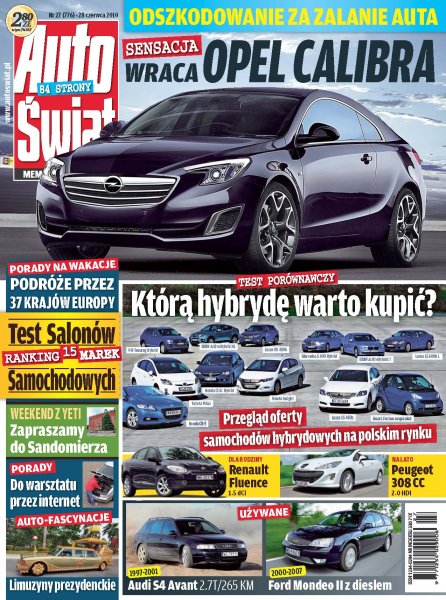 Opel rozważa opracowanie nowej generacji Calibry; Renault zamierza za rok wprowadzić do sprzedaży model z napędem elektrycznym; wielki test salonów samochodowych – cz. II; hybrydy to rozwiązanie przejściowe na drodze do całkowicie elektrycznej motoryzacji; jadąc na urlop należy nie tylko przygotować bagaż, ale auto i sprzęt turystyczny, który ze sobą zabieramy; niezbędnik wakacyjny – przepisy w Europie; czy za granicą można używać nielegalnych w Polsce reflektorów; ogromna liczba wypadków z udziałem motocyklistów wynika z niedoszkolenia i braku umiejętności przewidywania; używany Ford Mondeo II z silnikami Diesla.