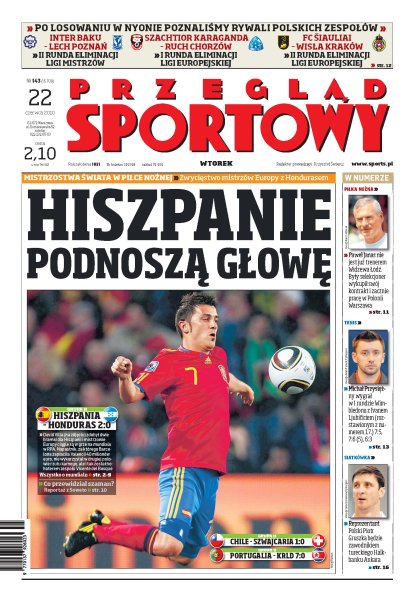 Hiszpania pokonuje Honduras 2:0; Paweł Janas odszedł z Widzewa Łódź na rzecz Polonii Warszawa; reprezentant Polski w siatkówce Piotr Gruszka będzie grał w tureckim Halkbanku Ankara; Michał Przysiężny wygrał w I rundzie Wimbledonu z Ivanem Ljubiciciem.