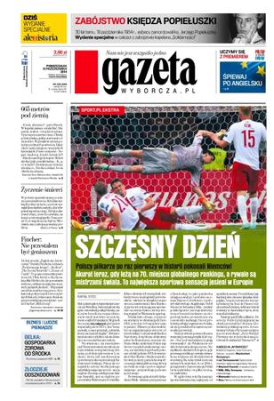 Polscy piłkarze po raz pierwszy w historii pokonali Niemców – to największa sportowa sensacja jesieni w Europie; sparaliżowany i załamany biznesmen z Kłodzka kupił polisy na życie, potem wynajął kryminalistę, a ten poderżnął mu gardło; dlaczego w programie lekcji języka obcego obowiązkowo powinny się znaleźć piosenki; wojna z Bliskiego Wschodu przenosi się na ulice niemieckich miast – płoną meczety, a radykalni muzułmanie walczą z Kurdami i jazydami; gwałtowna przecena ropy naftowej stała się pożywką dla teorii spiskowych; Wojciech Szczęsny Niemców zatrzymał, a Arkadiusz Milik i Sebastian Mila pokonali najlepszego bramkarza świata.