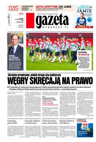 Po niedzielnych wyborach samorządowych Jobbik obsadził dwukrotnie więcej urzędów niż cztery lata temu; dlaczego prawicowe i kibolskie portale już piszą o Romanie Z. jako bohaterze walki z totalitaryzmem III RP; czy Kreml wycofuje żołnierzy ze wschodniej Ukrainy, bo uznał, że donbascy separatyści są już bezpieczni; Amerykanie ogłosili, że Turcja zezwoliła ich pilotom bombardującym kalifat na używanie swoich baz, ale Ankara tego nie potwierdza; złaknieni prądu Chińczycy rozwijają energetykę wodną, przegradzają rzeki, wznoszą tamę za tamą i wywołują groźne trzęsienia ziemi; jak bezpiecznie „odwrócić hipotekę”; Samsung ma głęboką kieszeń i wyśmiewa w reklamach tzw. iDiotów stojących w kolejce po iPhone’a; dzisiejszy mecz może pokazać, czy wygrana z Niemcami stworzyła drużynę zdolną awansować na Euro 2016 – aby zwyciężyć, Polacy muszą zagrać zupełnie inaczej niż z mistrzami świata.