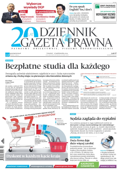 95,2 proc. młodzieży uczy się języka Szekspira, ale poziom ich wiedzy jest fatalny – po kilku latach nie potrafi ą się przedstawić; demografii a zachwieje szkolnictwem: najpóźniej w 2017 r. liczba maturzystów zrówna się z liczbą miejsc na pierwszym roku kierunków dziennych; czy zamierza pan/pani w ciągu najbliższych sześciu lat skorzystać z urlopu macierzyńskiego lub rodzicielskiego – na takie pytanie wczoraj, do godz. 15, musieli odpowiedzieć sędziowie; przedsiębiorstwa przemysłowe podnoszą pensje – już co dziewiąte wypłaca pracownikom średnio 5 tys. zł brutto; dlaczego edukować o bezpieczeństwie na drodze trzeba już najmłodszych – na długo przed tym, jak usiądą za kółkiem; dyskont w każdym kącie kraju – w kraju działa już 3298 tanich marketów, a plany zakładają, że w 2019 r. będzie ich dwa razy więcej.