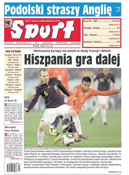 Hiszpania nie poszła w ślady Włoch i Francji i awansowała do kolejnej rundy mundialu; grono uczestników 1/8 finału powiększyło się także o Brazylię, Portugalię i Chile; przed nami spotkanie budzące wielkie emocje: Niemcy kontra Anglia; w Lidze Światowej we Wrocławiu Polska podejmuje Argentynę; Agnieszka Radwańska przegrała w grze podwójnej z zawodniczką, z którą dziś w singlu będzie walczyła o czwartą rundę Wimbledonu; przed Grand Prix Europy pojawiły się spekulacje o przejściu Kubicy do Mercedesa.