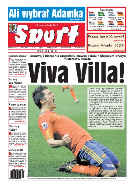 Znamy już stawkę ośmiu najlepszych drużyn mistrzostw świata; David Villa był autorem jedynej bramki dla Hiszpanów w szlagierowym meczu z Portugalią; Paragwaj po bardzo nudnym spotkaniu wyeliminował reprezentację Japonii; Wayne Rooney ma za sobą jedne z najgorszych występów w karierze; jaka przyszłość czeka Roberta Kubicę w Formule 1; Tomasz Adamek odebrał prestiżową nagrodę Muhammad Ali Award.