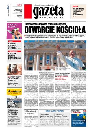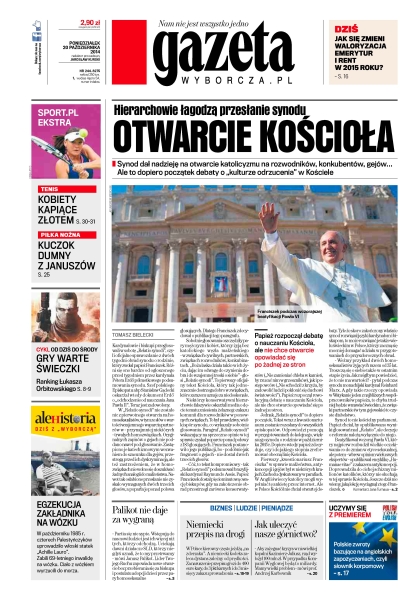 Synod dał nadzieję na otwarcie katolicyzmu na rozwodników, konkubentów, gejów, ale to dopiero początek debaty o „kulturze odrzucenia” w Kościele; po tygodniach targów z koalicjantami nowy premier Iraku skompletował rząd; dziesiątki poturbowanych i zatrzymanych to bilans niedzielnych starć w Hongkongu; skrajnie prawicowy Jobbik podbija serca Węgrów; nagroda Literacka Europy Środkowej „Angelus” dla powieści „Zdarzyło się pierwszego września...” Słowaka Pavola Rankova; ponad 8 mln emerytów, rencistów i osób na świadczeniach przedemerytalnych dostanie w przyszłym roku większe podwyżki; dlaczego Niemcy mają lepsze przepisy drogowe; startuje Masters w Singapurze, dowód na to, że kobiecy tenis to biznes ze szczerego złota.
