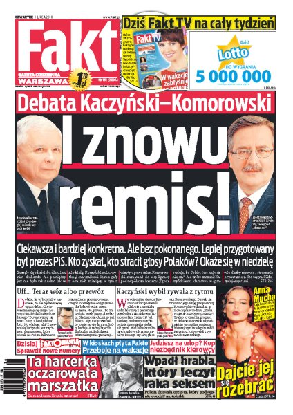 Sprawdź, jaki był wynik drugiej i ostatniej debaty prezydenckiej przed niedzielnymi wyborami; Anna Komorowska pokazuje zdjęcia z lat młodości; tragedia budowlana w Chorzowie - zginęły cztery osoby; bezwzględny bandyta ukradł emerytce tysiąc złotych odłożone na trumnę; już niedługo Anna Mucha rozbierze się na dużym ekranie; jak Cezary Pazura spełnia się w roli reżysera; wywiad z Krzysztofem Cugowskim.