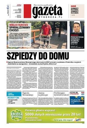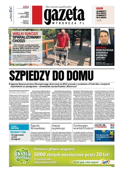 Agencja Bezpieczeństwa Wewnętrznego skierowała do MSZ wniosek o wydalenie z Polski kilku rosyjskich dyplomatów za szpiegostwo – dowiedziała się nieoficjalnie „Wyborcza”; opozycja żąda dymisji marszałka Sejmu - za jego konferencję przeprasza dziennikarzy premier Ewa Kopacz, a Sikorski przyznaje, że się zagalopował i zawiodła go pamięć; 5,5 mln zł zniknęło razem z „facetem w kominiarce” - we wrocławskiej sortowni wciąż zastanawiają się, jak ta prymitywna kradzież mogła się powieść; Polska grozi, ale coraz ciszej, zgłoszeniem weta na szczycie UE, który ma w czwartek zająć się nowym pakietem klimatycznym; dzięki polskim i angielskim lekarzom sparaliżowany od klatki piersiowej w dół Darek Fidyka znowu chodzi; UOKiK chce, by klienci banków i ubezpieczycieli nie byli wprowadzani w błąd przez instytucje finansowe - proponuje zmiany prawa i nakłada 50 mln zł kar.
